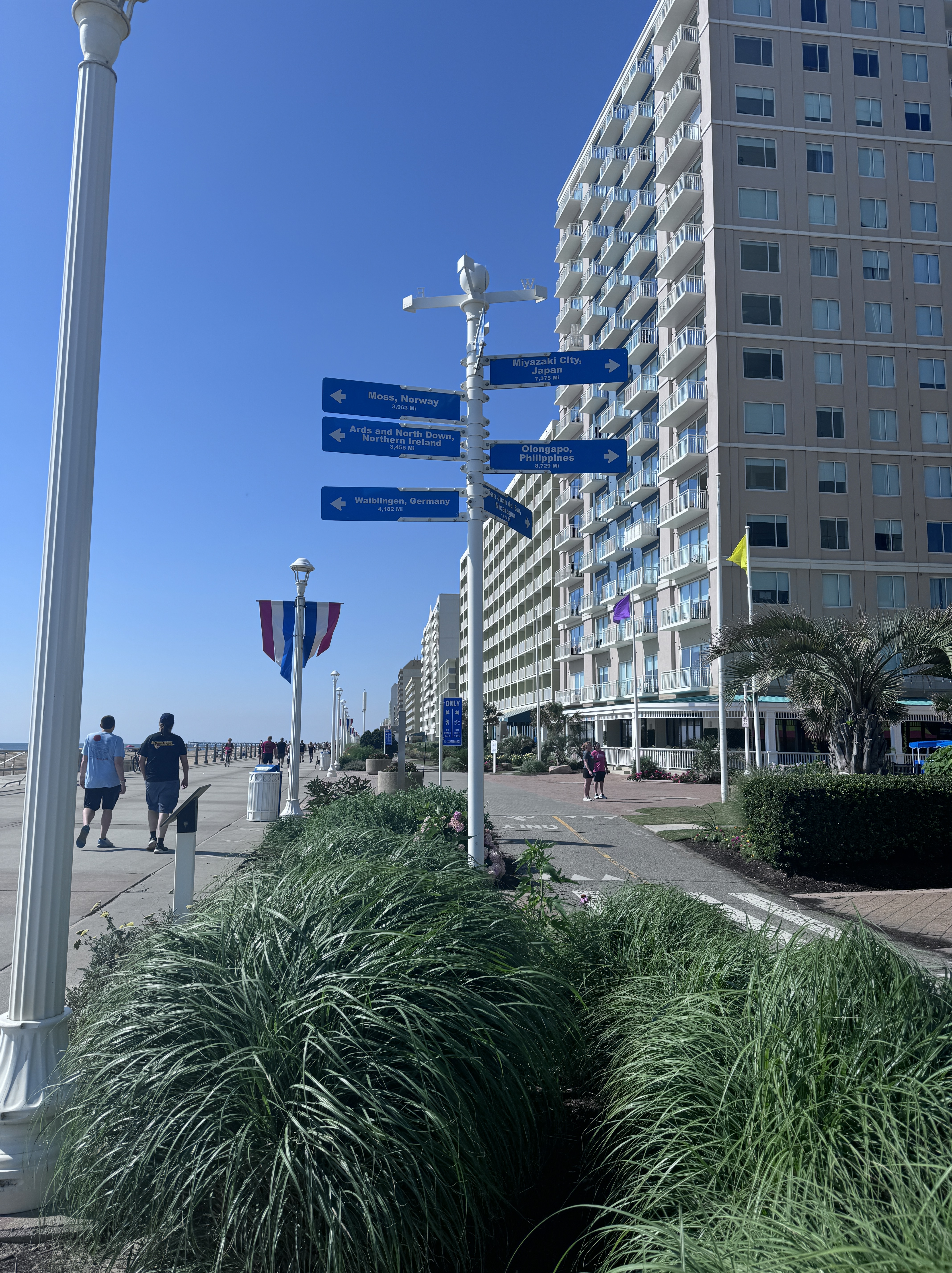 The oceanfront concrete boardwalk is accessible to everyone. There is a separate paved path just for bicycles. Blooming flowers line the oceanfront and beachfront benches welcome one to sit and relax.