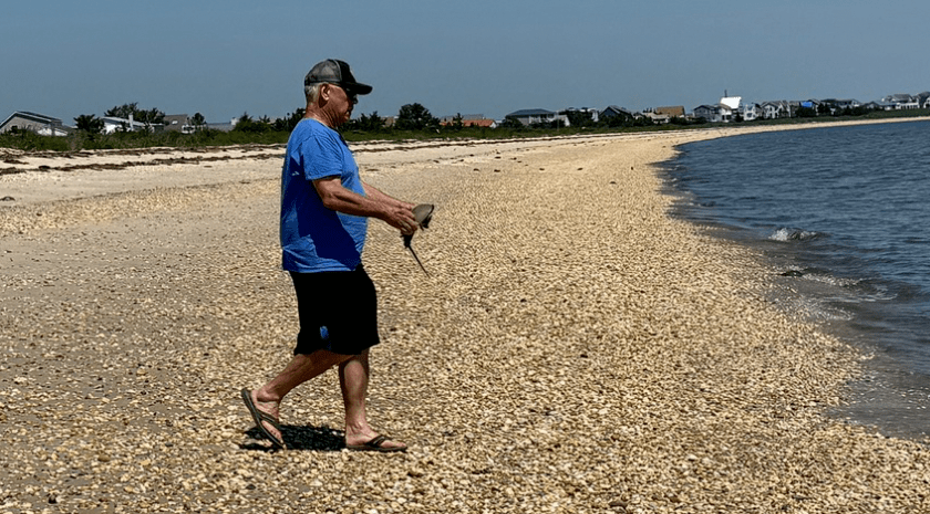 IMPORTANT NOTE: It’s important not to flip them by their tail. Even though it looks scary, the tail is delicate and can be easily damaged. The best way to turn them over is by the edge of their shell. Horseshoe crabs do not bite or sting. If they seem a bit lifeless, tap the shell, if they move help them get to the water.